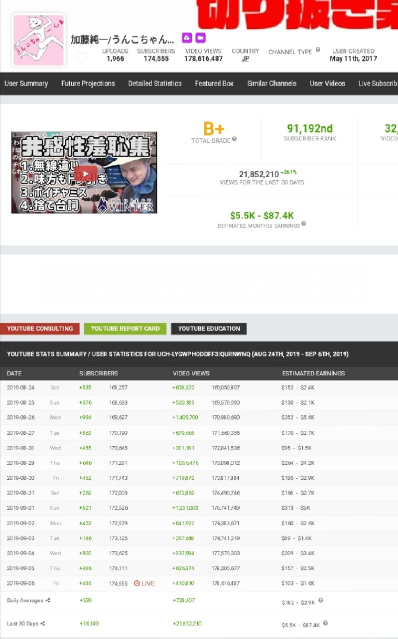 加藤純一の切り抜きの先月の月収www 2019年09月25日 1: 名無しさん 2019/09/07(土) 10:50:27.79 ID:ONdbdyIa0 過去30日の再生回数が2180万再生 1再生あたりの単価だけど、上場したuuumが毎期、加入しているYouTuberの公平均クリック単価を公表していて、現在は0.3円 つまり月収630万くらいの可能性が高い 【加藤純一の切り抜きの先月の月収www 】の続きを読む